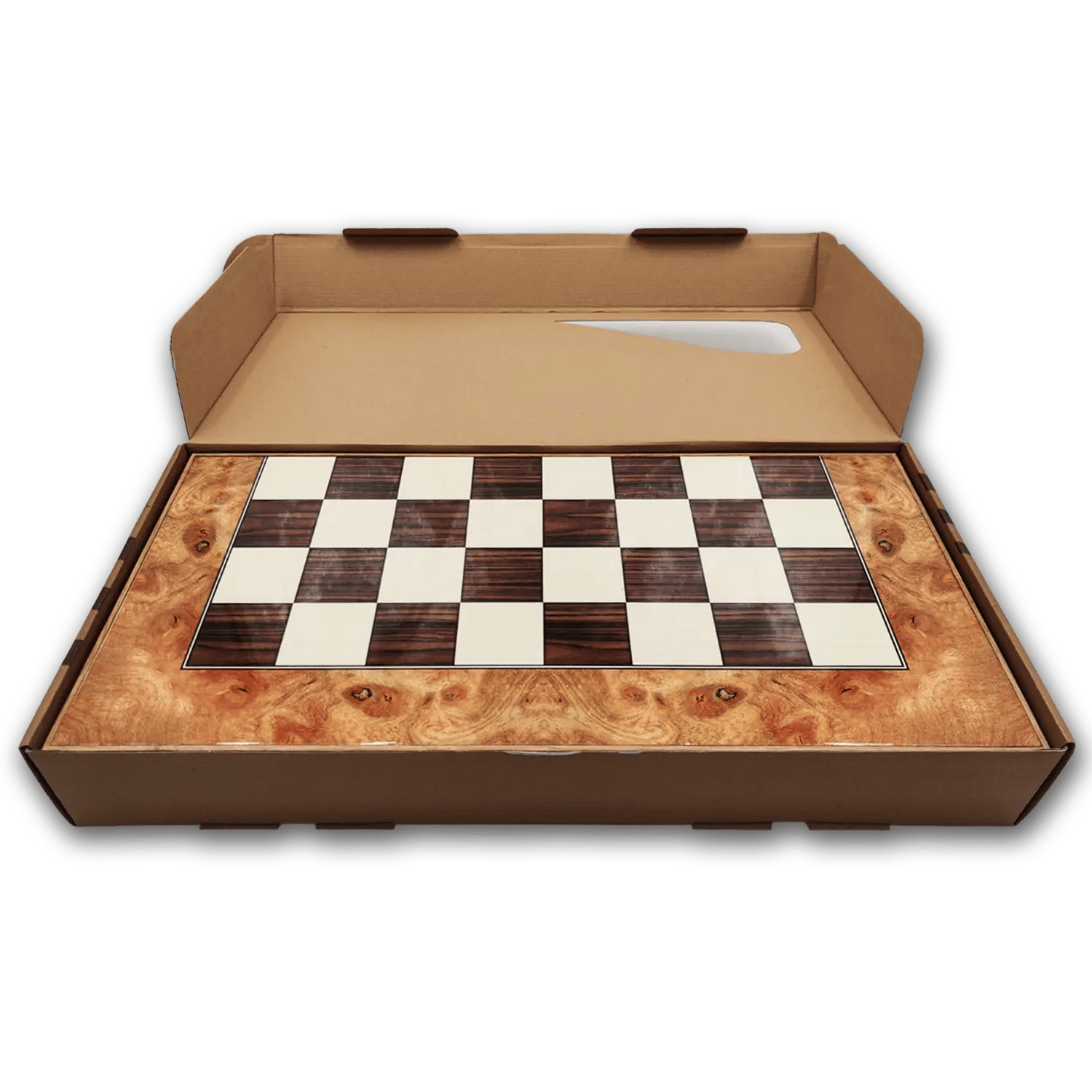 De bijgeleverde schaakstukken passen gemakkelijk in de houten doos, met (krachtige) magnetische sluiting. Naast deze XXL variant heeft The Game Room ook een combi set in L-uitvoering (rosékleurig) beschikbaar.