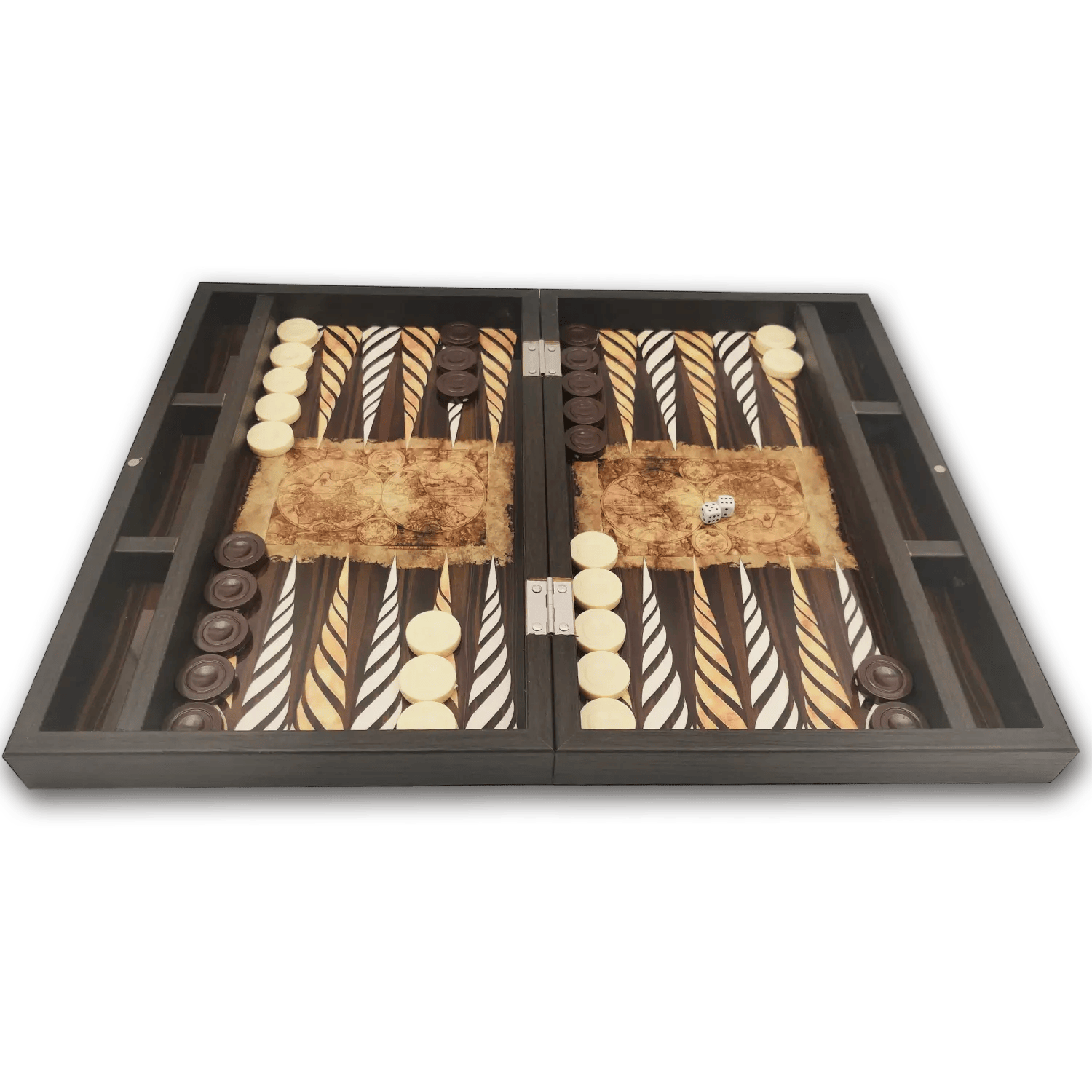 Uniek Backgammon spel met oude map van de wereld