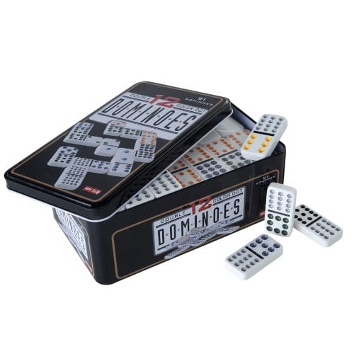 Het spel Double Domino 12 bevat 91 stenen en komt in een handig blik. Weet jij als eerste al je stenen kwijt te raken?