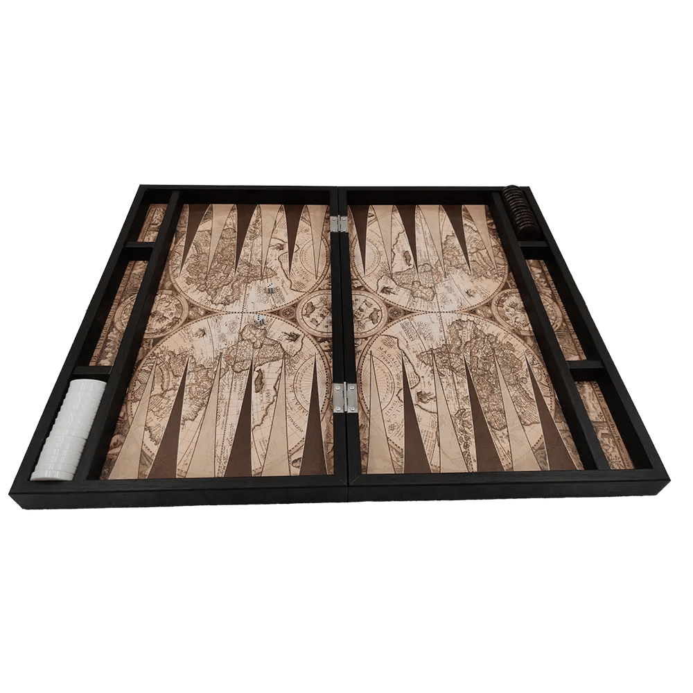 Stap terug in de tijd en beleef het oude spel van Backgammon op een moderne en trendy manier met het Yenigün Tavla bordspel. Dit unieke bordspel is geïnspireerd op de oude wereldkaarten en heeft een prachtige leren afbeelding van een historische wereldmap op de buitenkant en binnenzijde van het bord.