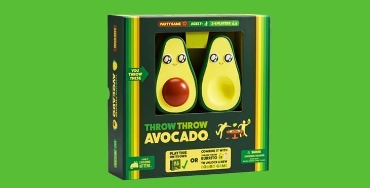 De makers van Exploding Kittens komen met een vervolg op het partyspel Throw Throw Burrito. In Throw Throw Avocado maakt de burrito plaats voor the Millennial’s favorite. Spelers verzamelen kaarten en moeten de door de lucht vliegende avocado’s zien te ontwijken. Een soort partygame meets trefbal dus.