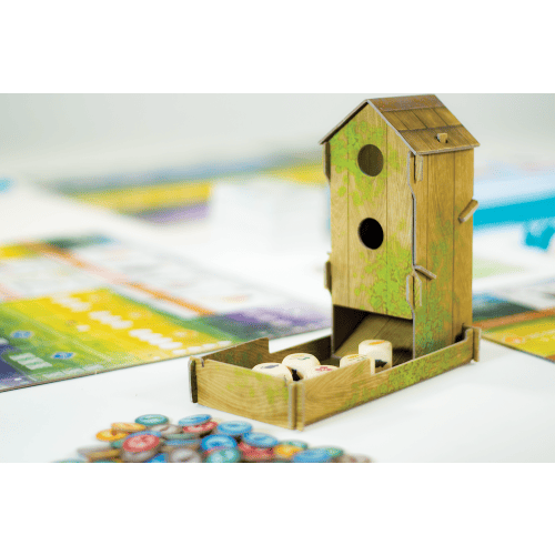 Het vogelhuisje dient als dobbeltoren. Wanneer het voedsel vernieuwd moet worden, gooi je de dobbelstenen in het vogelhuisje waarna je er voedsel uit kunt kiezen tijdens je beurt.