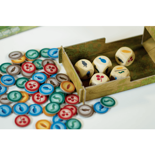 Er zitten 5 dobbelstenen in het spel waarop voedsel gedrukt staat. Het voedsel op de dobbelstenen komt overeen met het voedsel op de fiches: ongewervelden, zaden, vis, fruit en knaagdieren.