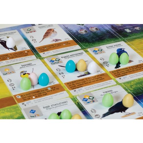 Eieren hebben eigenlijk twee doelen: je gebruikt ze als betaalmiddel om vogels te spelen in kolom 2 tot 5 per natuurgebied op je spelersbord. Het tweede doel is het plaatsen van eieren op vogels. Je krijgt aan het einde van het spel namelijk 1 punt per ei die op een vogelkaart ligt.