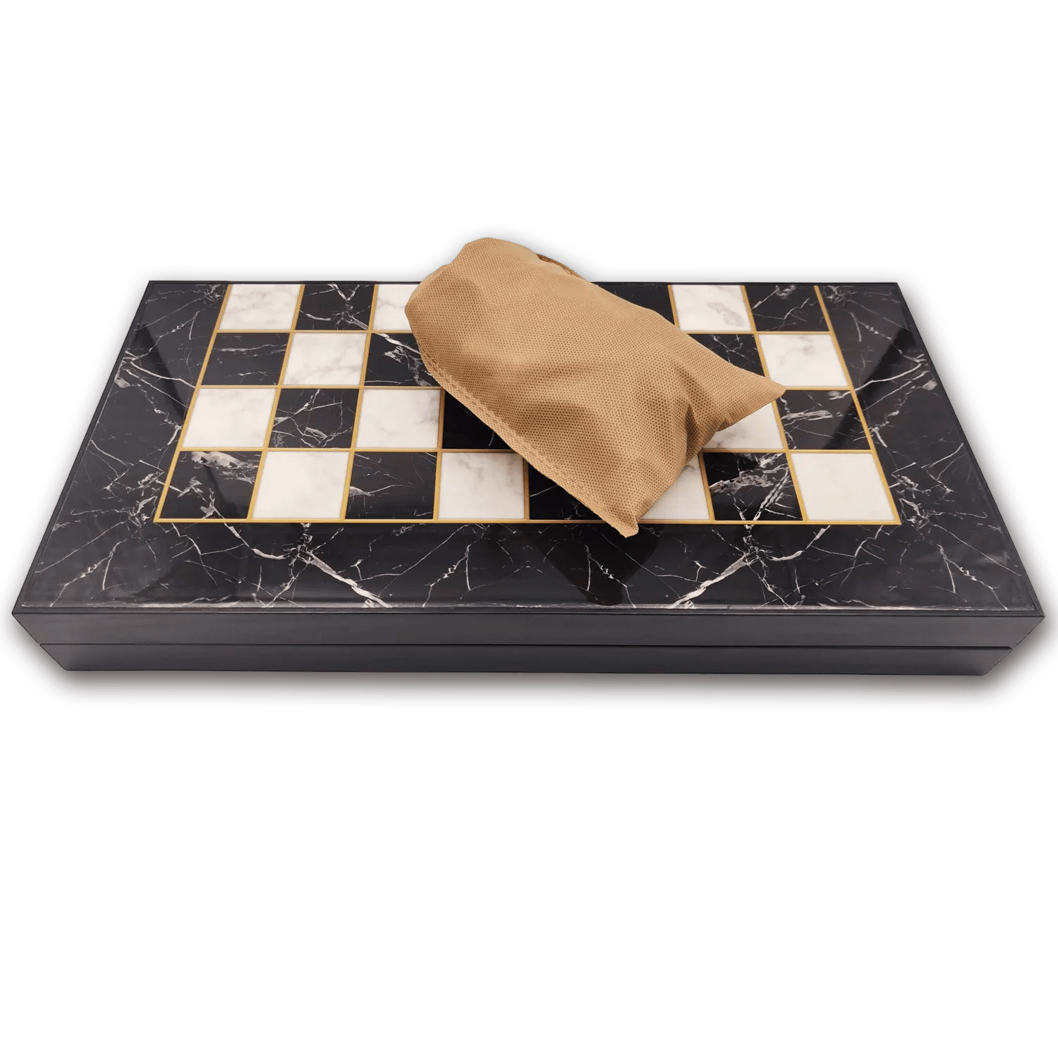 Een extra groot Backgammon bord (48 cm) met zwarte marmerlook. Op de achterzijde van het bord kun je schaken. Deze set wordt geleverd inclusief houten schaakstukken waarbij je profiteert van €10,99 combinatievoordeel.